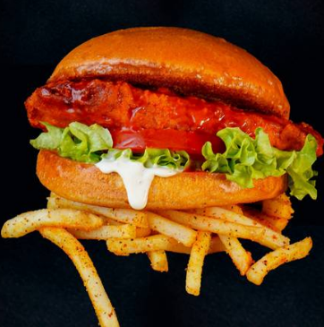 Pechuga crunch de 150g bañada en salsa Red Hot, verdura, aderezo ranch y pan artesanal.. Acompañada de 125g de papas a la francesa."