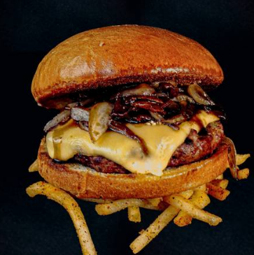 200g de carne de res asada al grill, cebollas bañadas en salsa caramelo y 1 pz de tocino crujiente. Acompañada de 125g de papas a la francesa.