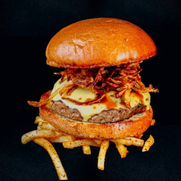 200g de carne de res asada al grill, mayonesa, mostaza, queso gouda y cebollas crunch bañadas en salsa BBQ. Acompañada de 125g de papas a la francesa.