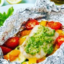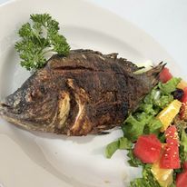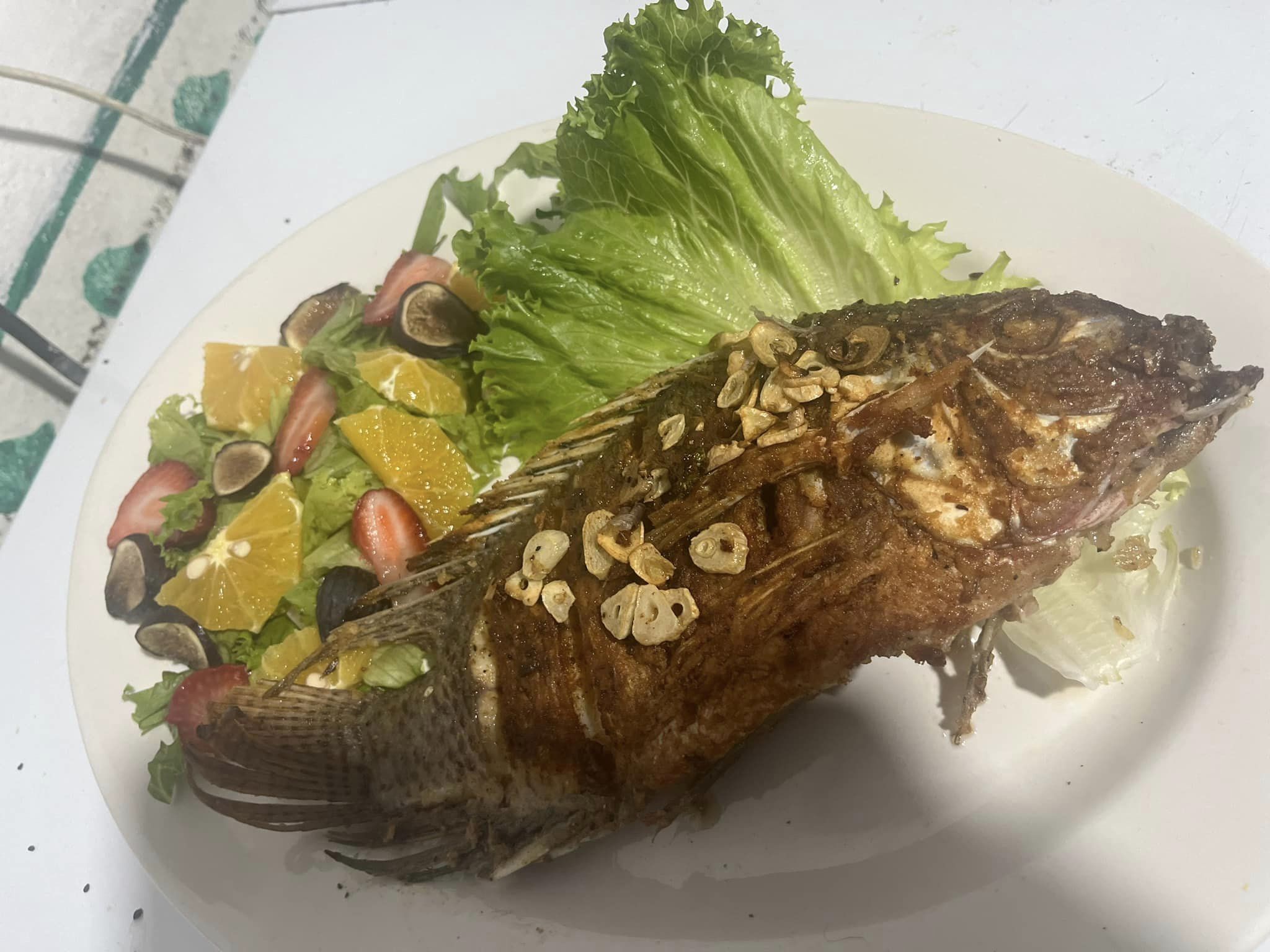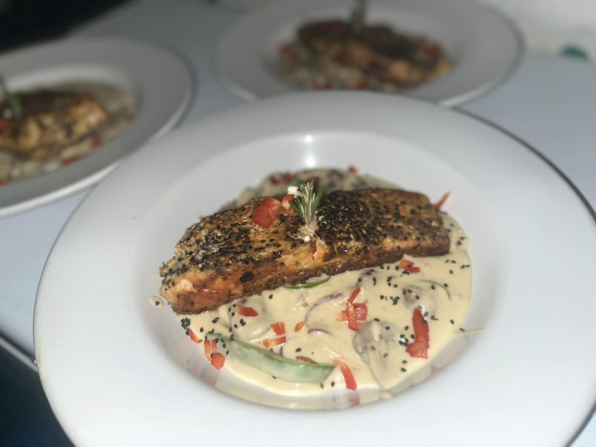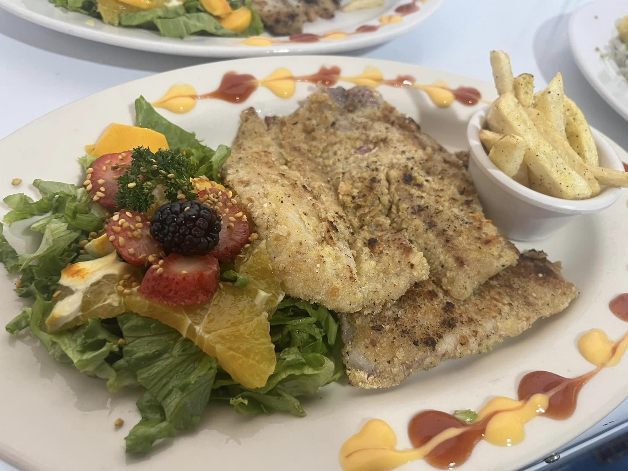 Con salsa de mango, verduras a la mantequilla, arroz y ensalada.