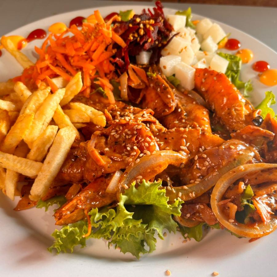 Con papas a la francesa, ensalada, arroz y agua.