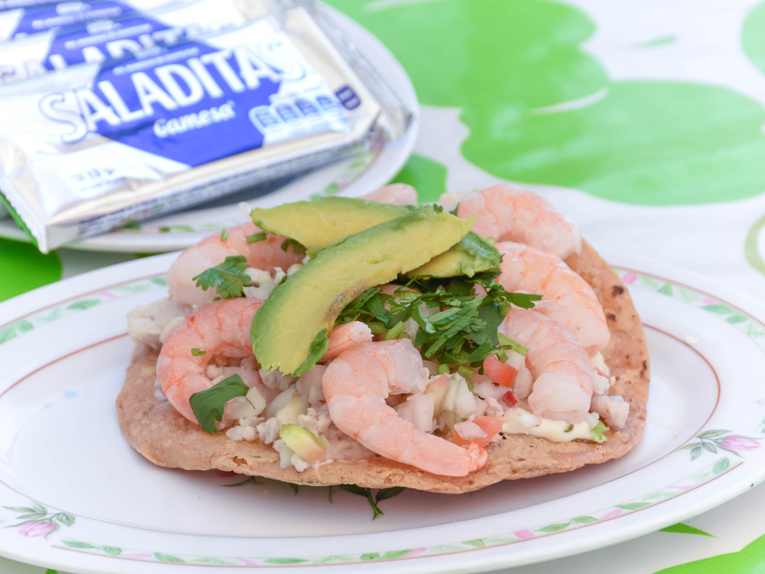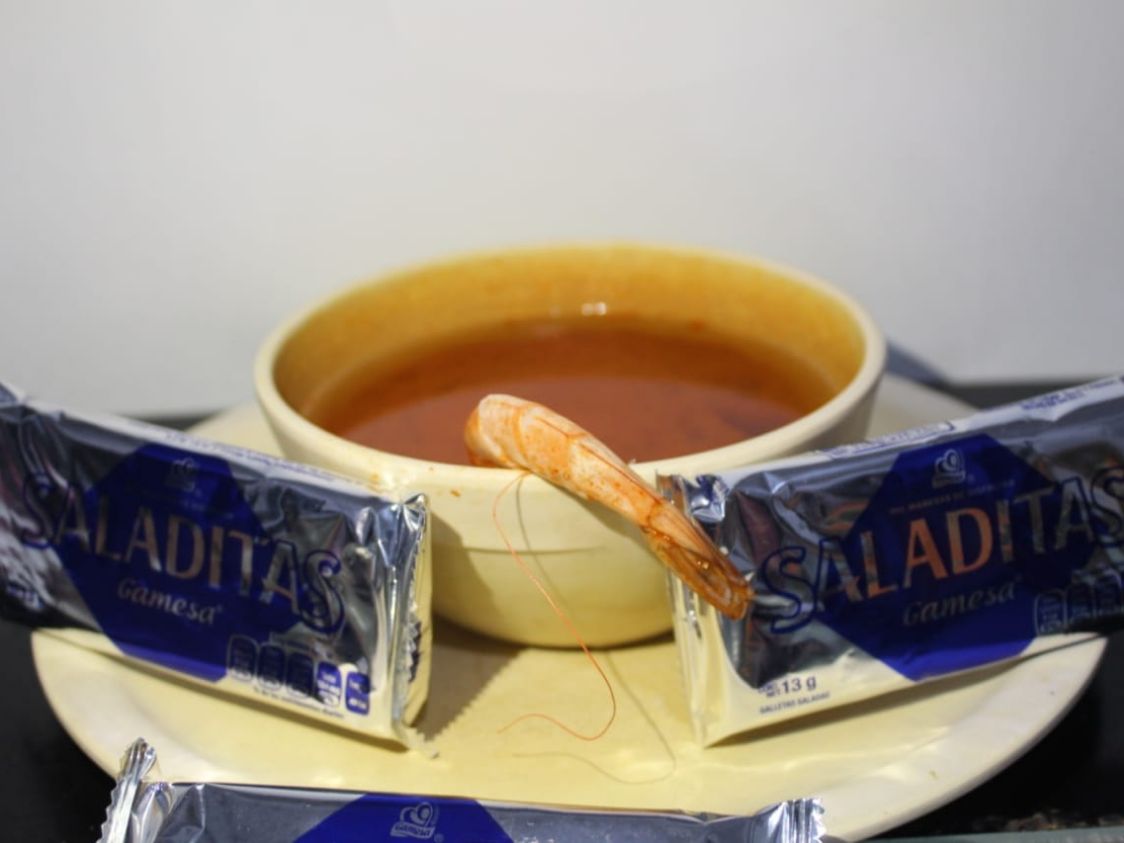 Caldo de camarón con 1 camarón con cáscara. Incluye unas saladitas