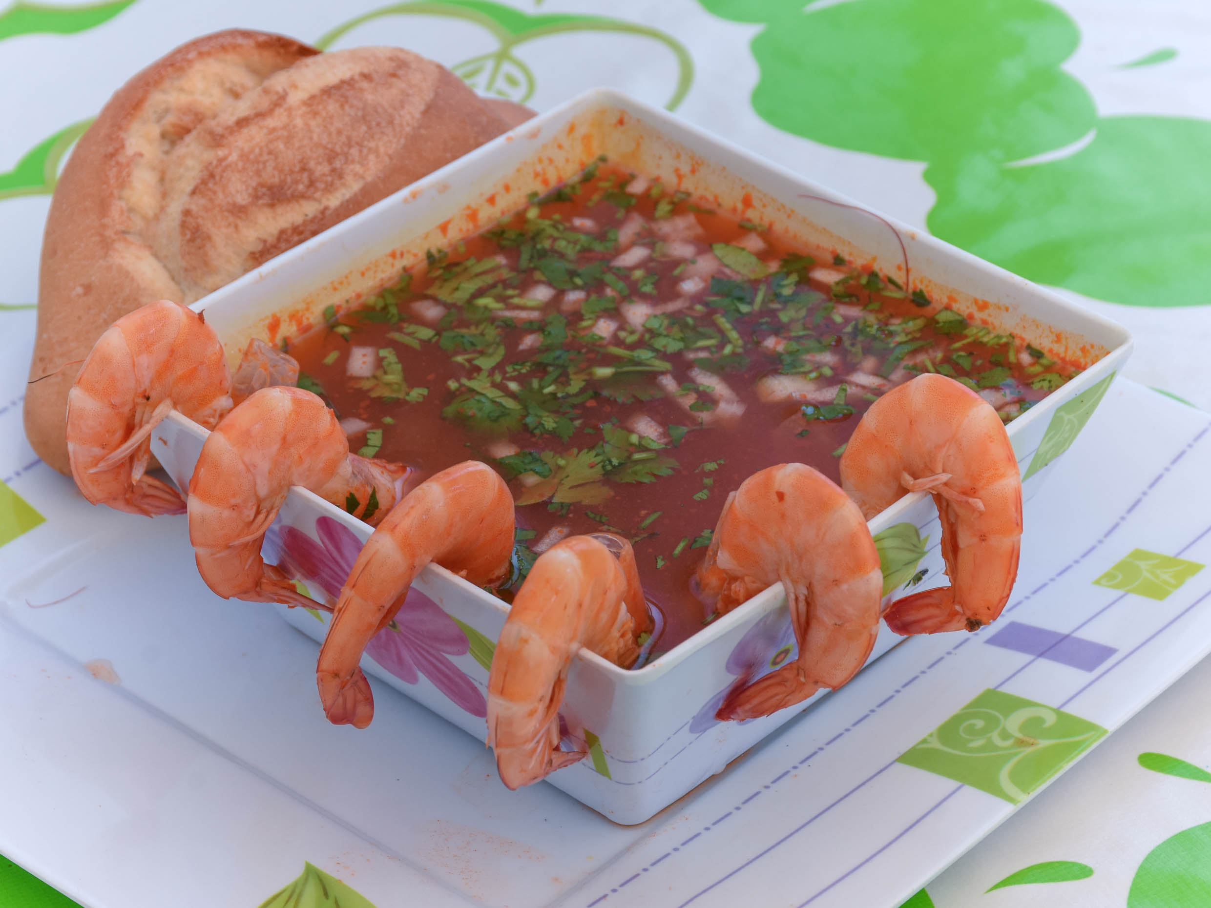 Caldo de camarón con calmar, pulpo, filete de calamar, pescado, camarón con cascara y camarón pelado. Incluye 1 bolillo. Chica en un vaso de 946 ml; Grande en un vaso de 946 ml y un vaso de 473 ml