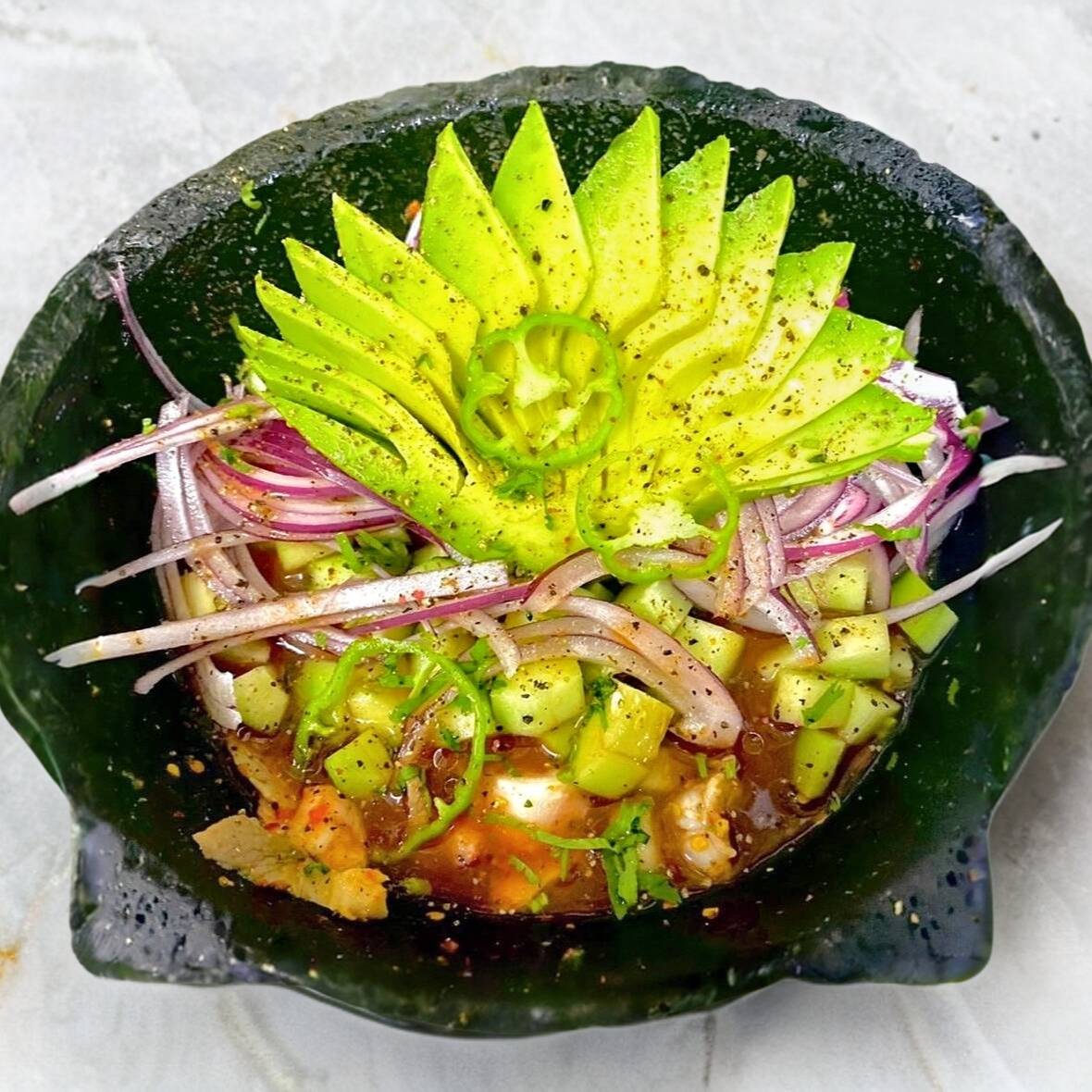 En su concha, cilantro, cebolla, salsas negras, pimienta, aguacate y camarón.