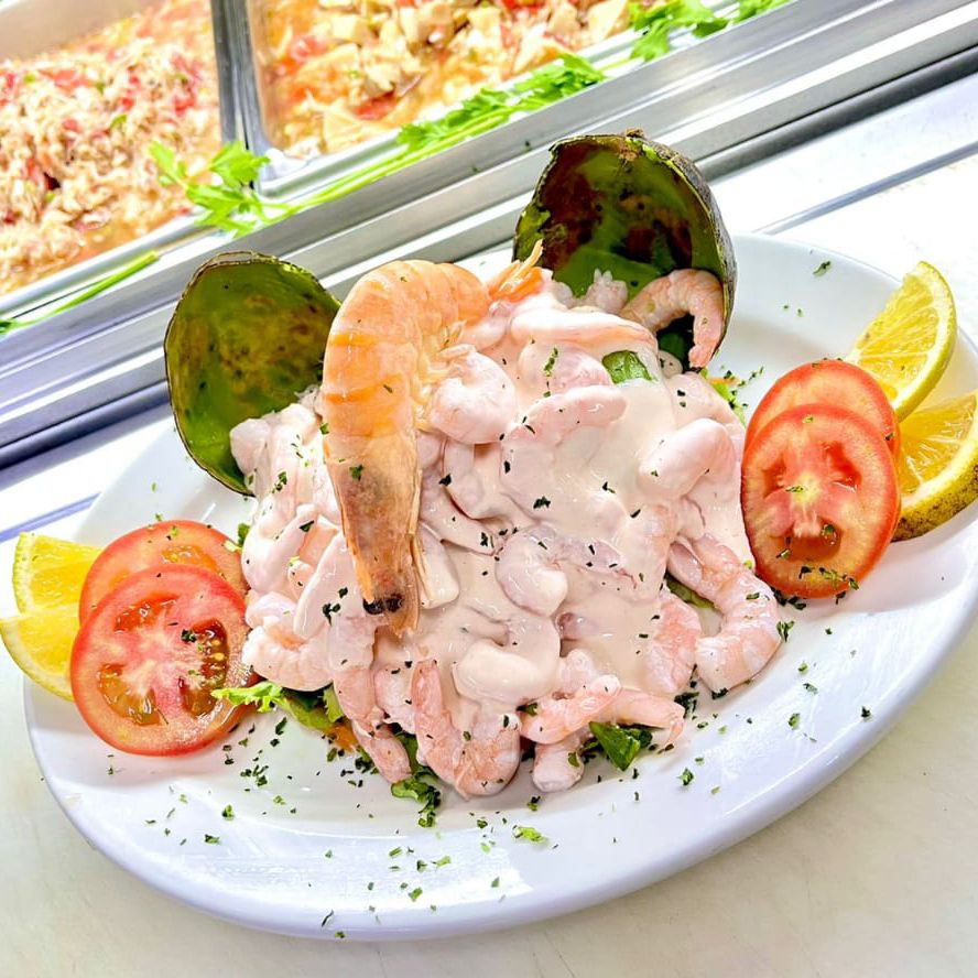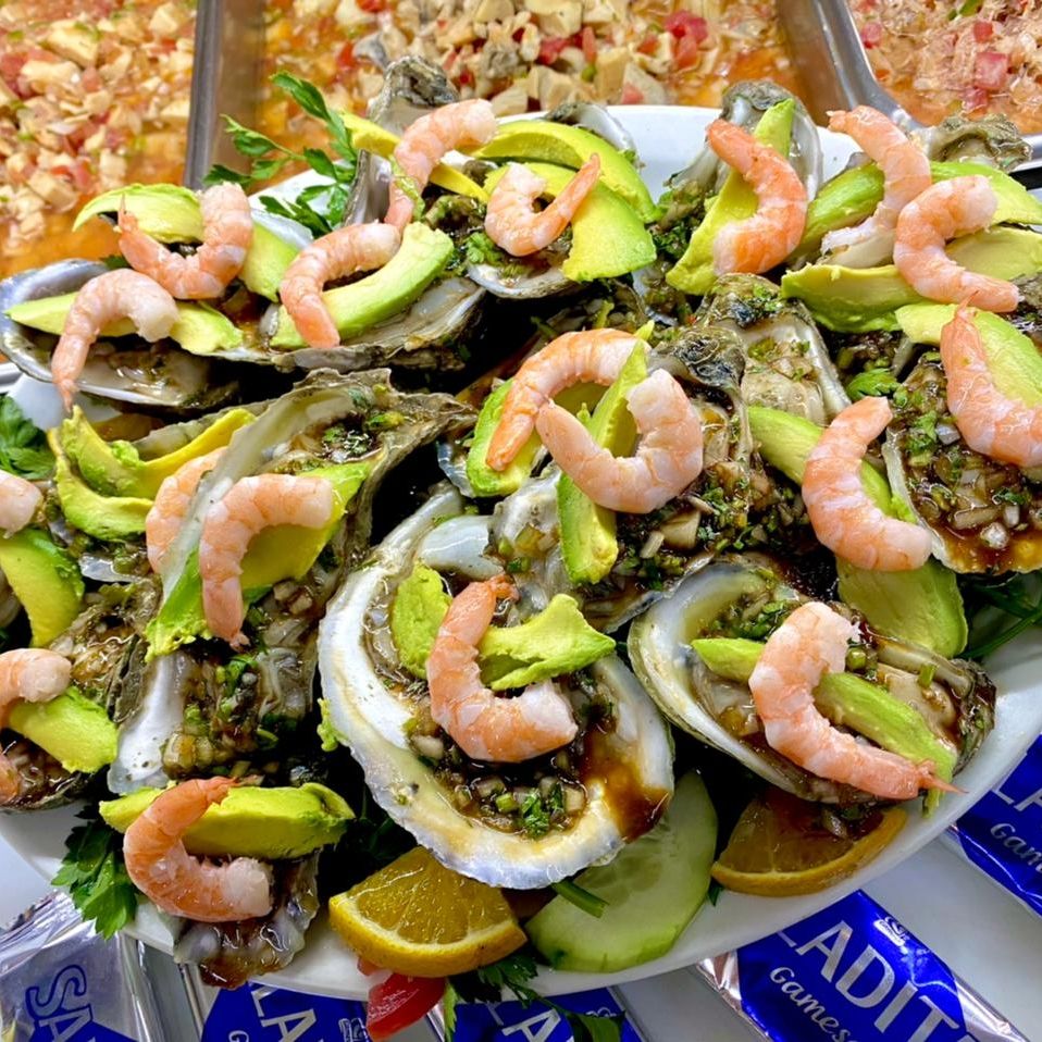 Todos los ceviches, ostión y camarón preparados con cátsup, cilantro y aguacate.