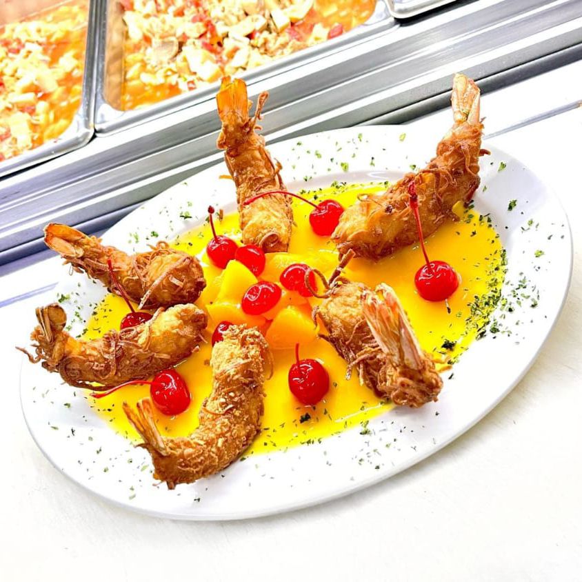 Empanizados con coco rayado en una base de salsa de mango.