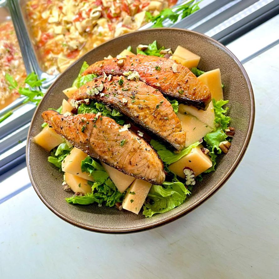 Lechuga, melón, nuez, aderezo mil islas y 150 g de salmón.