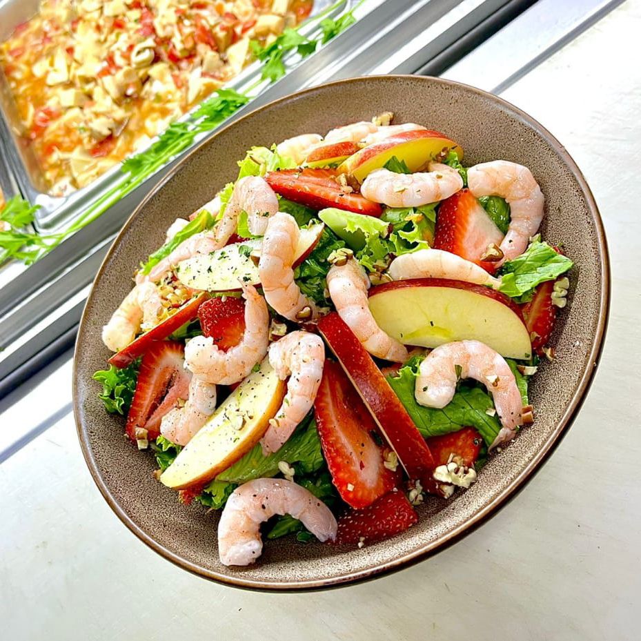 Lechuga, manzana, fresa, durazno, camarón pacotilla, aderezo de fresa, con un toque de la casa.