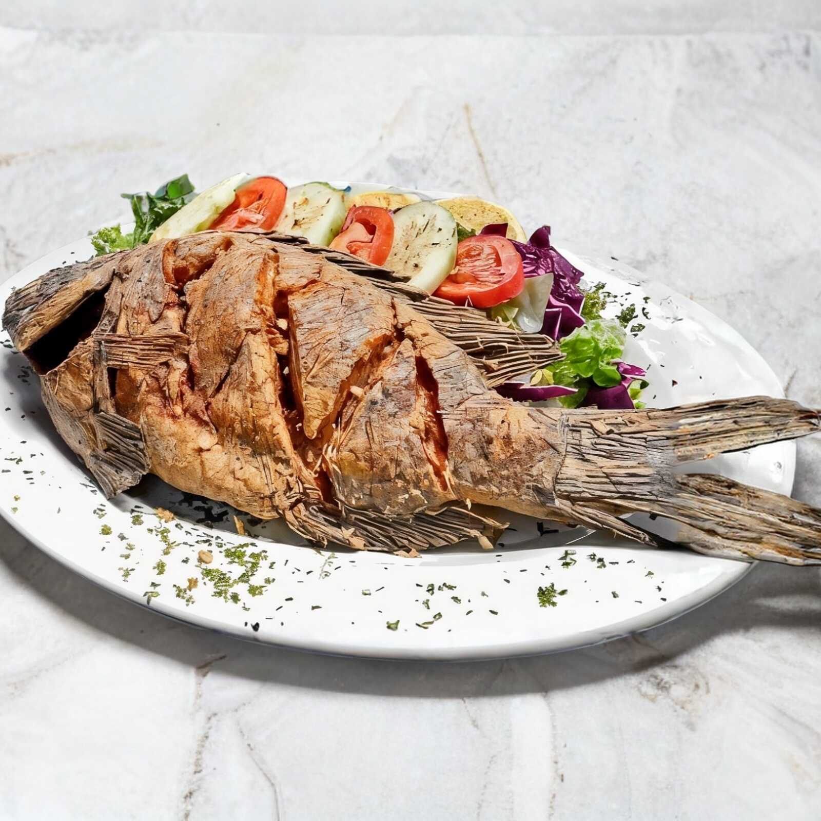 Camarón, pulpo, calamar, paprika, queso manchego, servido en su corteza.