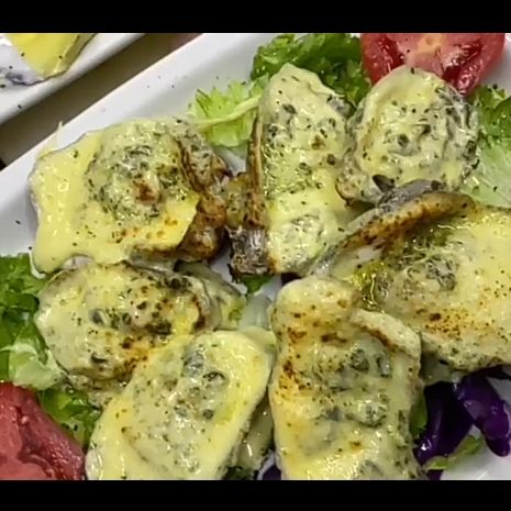 En su concha, bañados en salsa rockefeller con queso manchego.