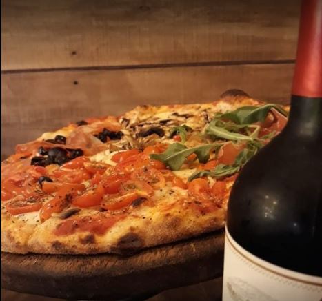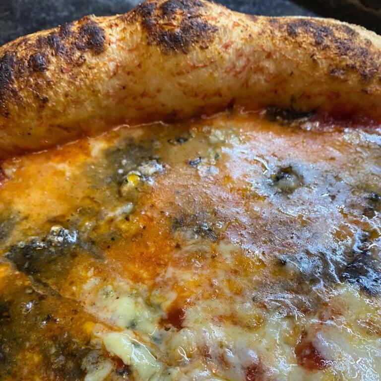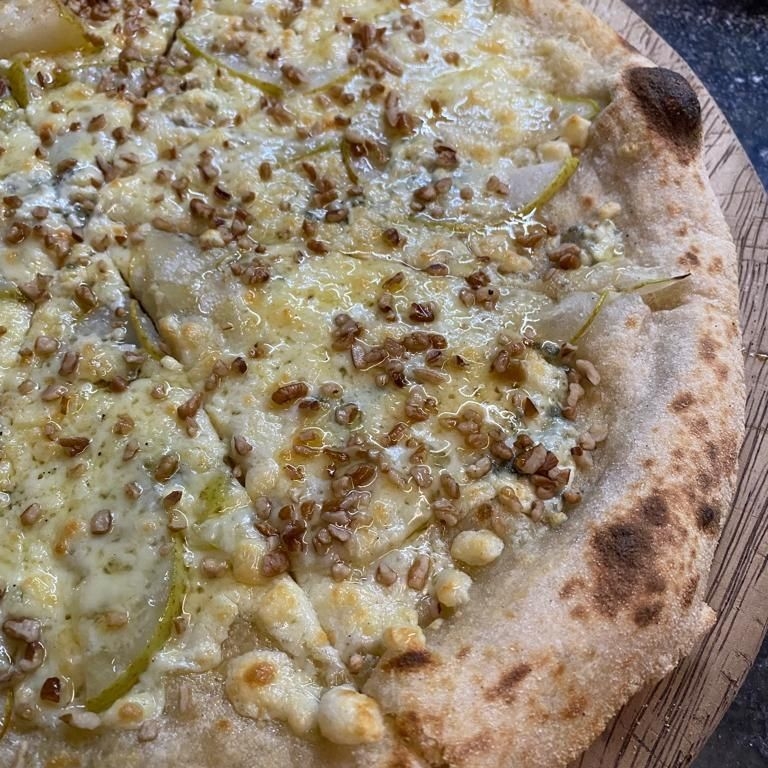 Bianca, mozzarella, pera, queso gorgonzola, miel y trozos de nuez. Grande 35 cm. 8 rebanadas.