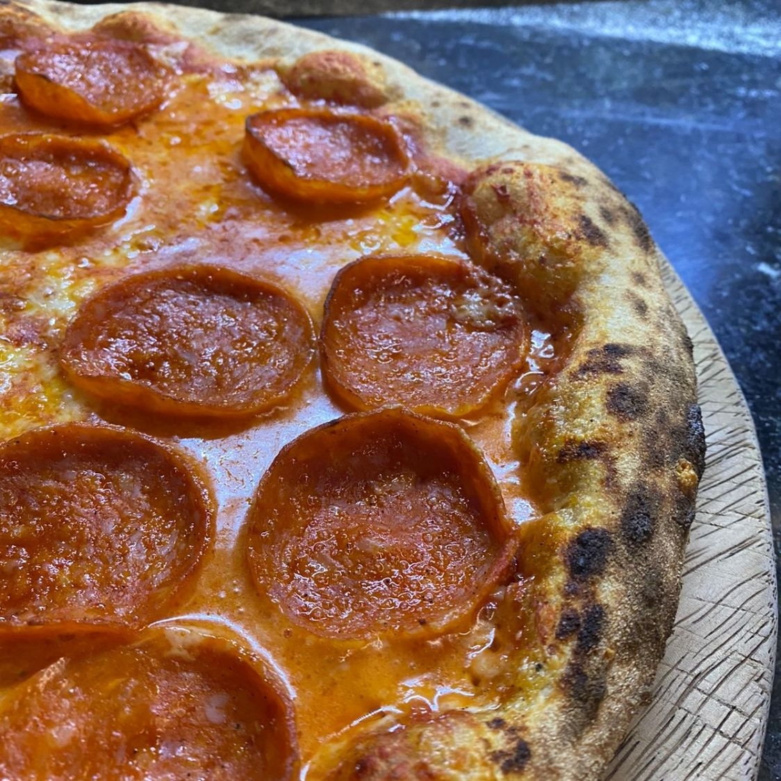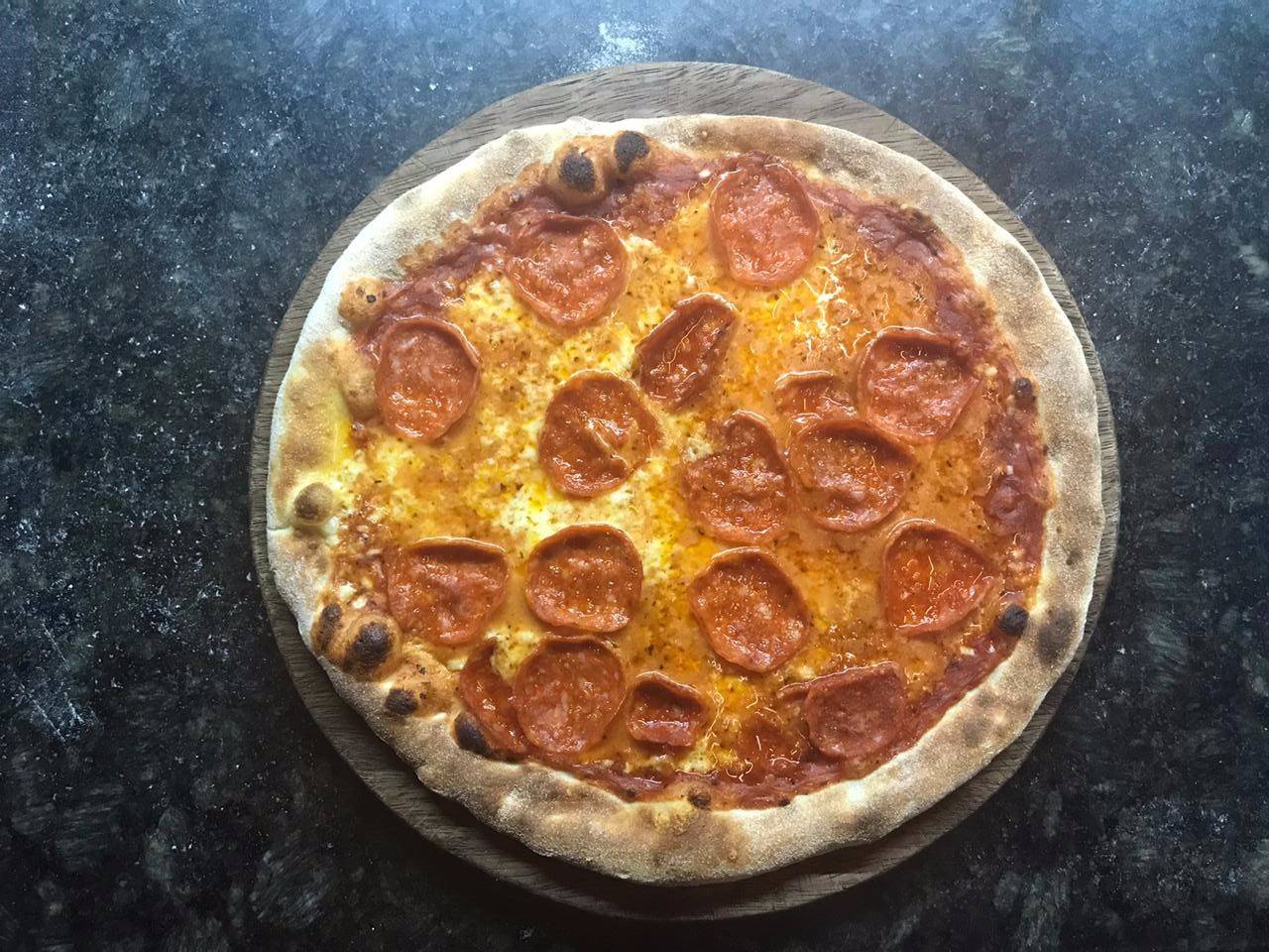 Pomodoro, mozzarella y peperoni. Grande 35 cm. 8 rebanadas.
