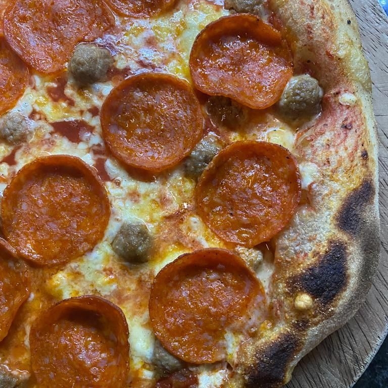 Pomodoro, mozzarella, salchicha italiana, papas al horno y aceite de olivo picante. Grande 35 cm. 8 rebanadas.