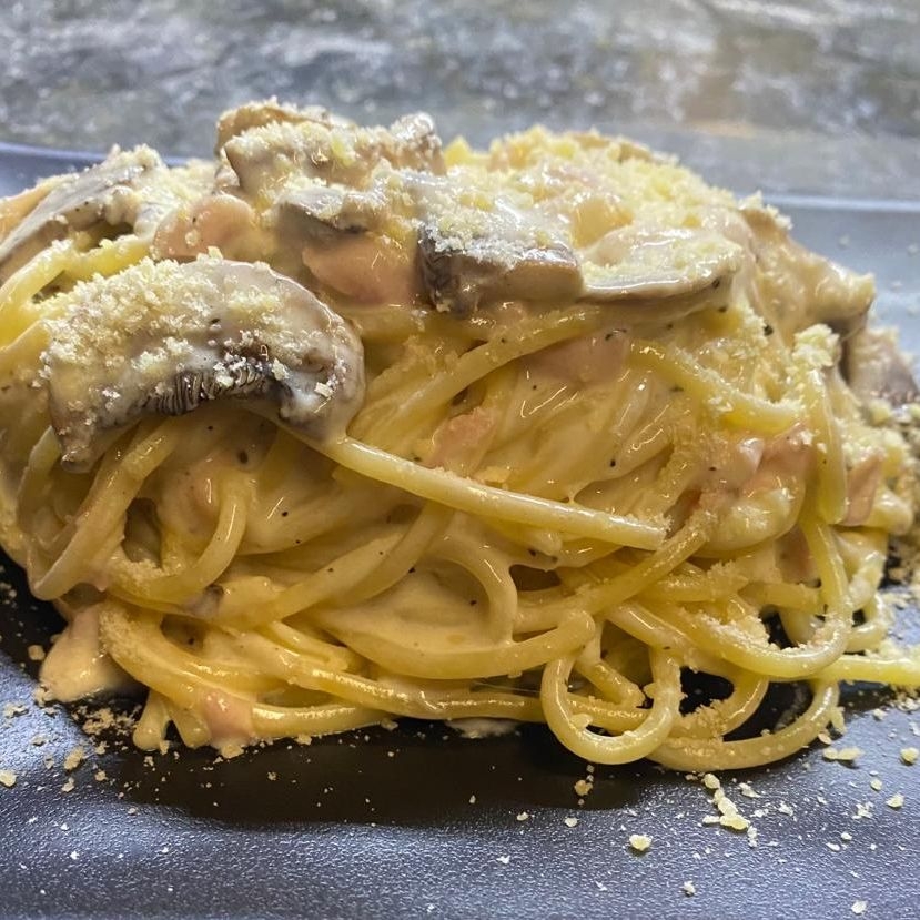 PASTA en Salsa cremosa de queso, acompañada de jamón de pierna y champiñones rostizados.