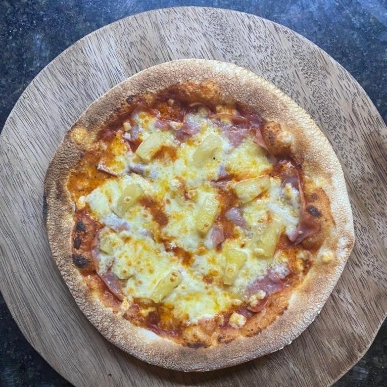 Pomodoro, mozzarella, jamón de pierna y piña. Grande 35 cm. 8 rebanadas.