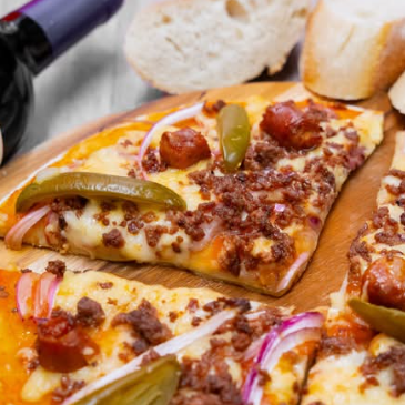 Pizza de masa delgada con carne molida, chistorra, chile jalapeño y cebolla morada; ¡seguro equilibra tu hambre! Elaborada al momento en nuestros hornos de piedra.