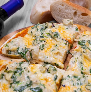Pizza de masa delgada con preparación especial de espinacas, corazón de alcachofa, queso de cabra y queso ricotta; sin duda, ¡una de las estrellas! Elaborada al momento en nuestros hornos de piedra.