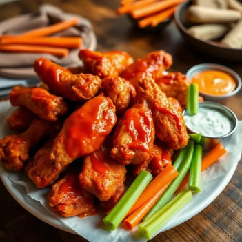 Alitas búfalo, marinadas por varias horas, logrando un sabor único, crujientes por fuera y jugosas por dentro, ¡cuidado, son adictivas!