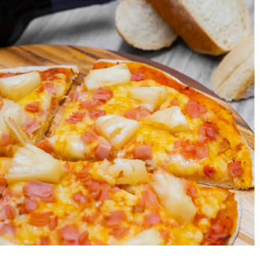 Pizza tradicional hawaiana de masa delgada con jamón y piña en almíbar, simplemente perfecta.