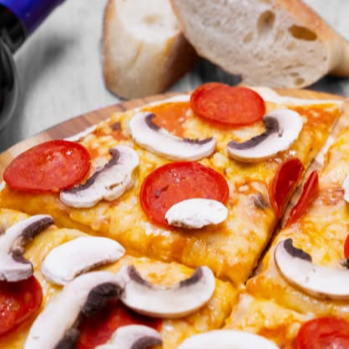 Pizza de masa delgada con pepperoni y champiñones; ¡la mejor combinación! Elaborada al momento en nuestros hornos de piedra.