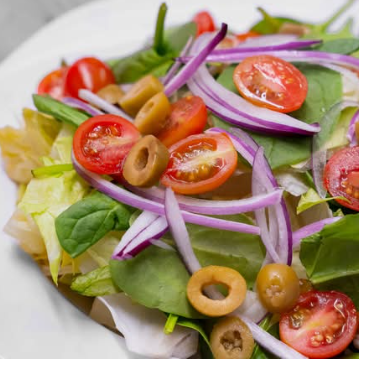 Ensalada de mix de hojas verdes, queso de cabra, jitomate cherry, aceituna verde, cebolla morada, pepino y aderezo de mostaza con miel.