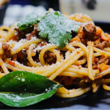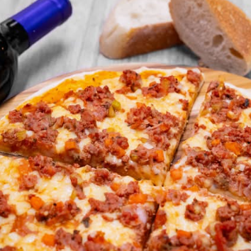 Pizza de masa delgada con bolognesa de la casa (carne molida, apio, zanahoria, cebolla, ajo, jitomate y hierbas italianas). Elaborada al momento en nuestros hornos de piedra.