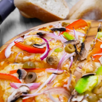 Pizza de masa delgada con pimiento morrón rojo y verde, cebolla morada, aceitunas verdes y champiñón; ¡lo mejor de lo mejor! Elaborada al momento en nuestros hornos de piedra.