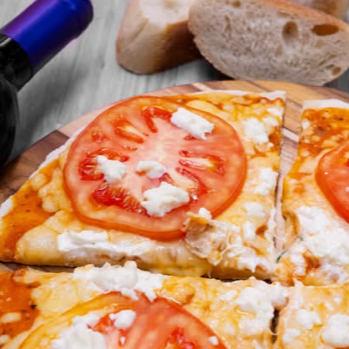 Pizza de masa delgada con jitomate bola y queso de cabra; ¡para los conocedores! Elaborada al momento en nuestros hornos de piedra.