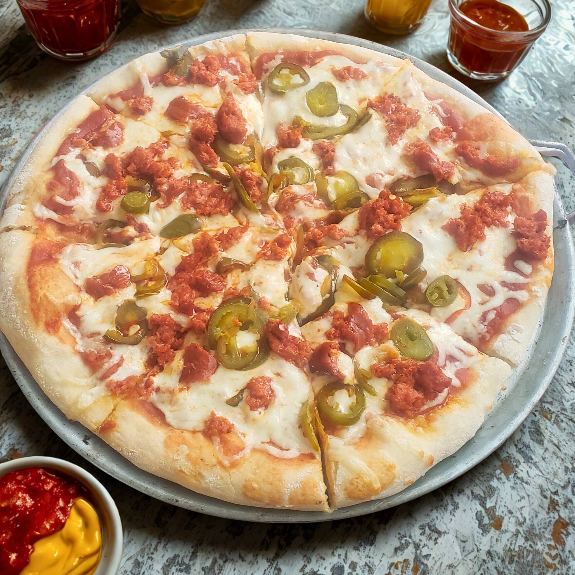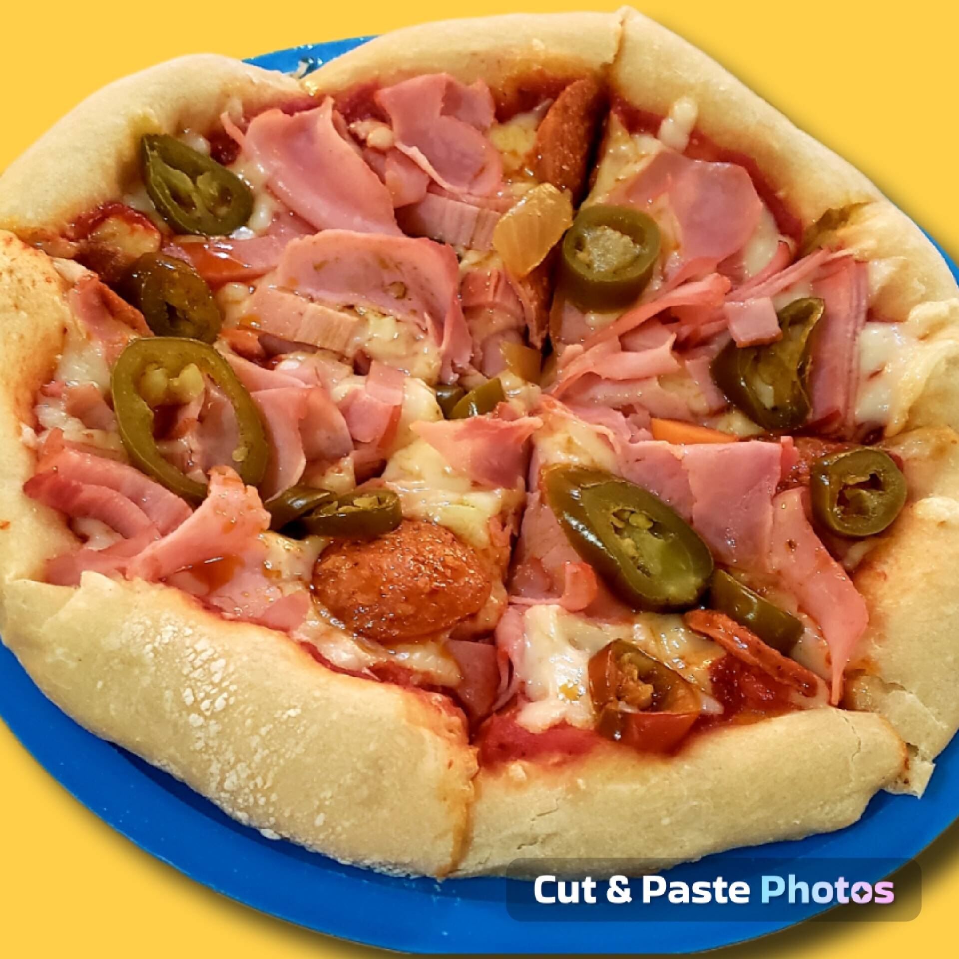 Pizza 8 porciones queso Mozzarela salsa de tomate pierna, jamon,longaniza,peperoni,jalapeños