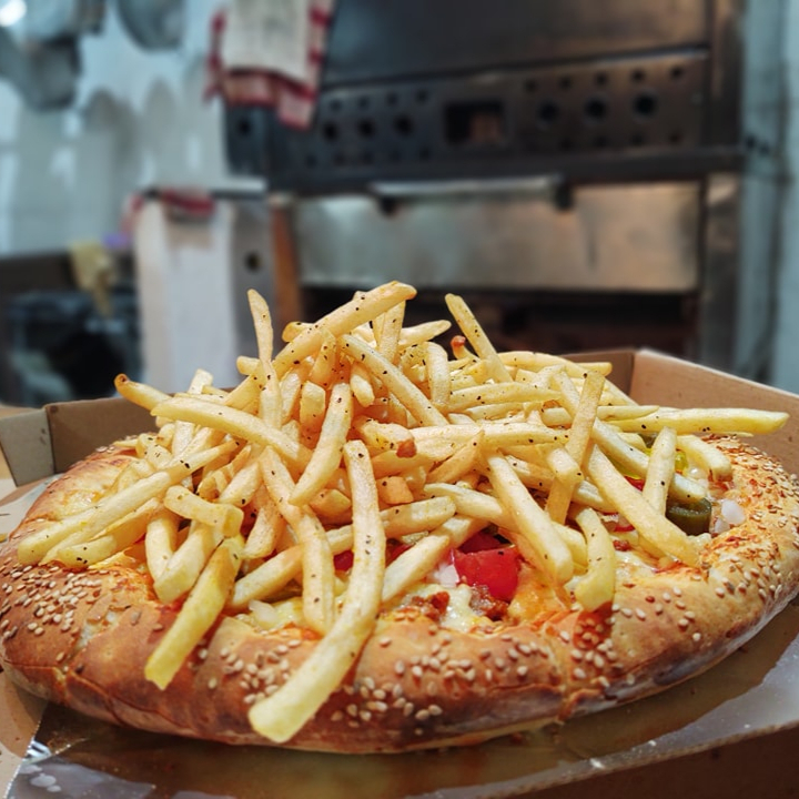 Pizza con tamaño a elegir, boloñesa, jitomate, jalapeño, cebolla, pepinillo y papas a la francesa.