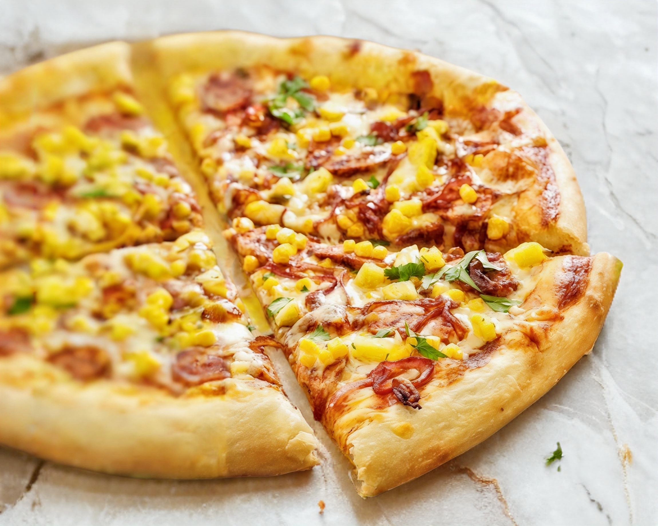 Salsa de tomate, queso mozarella, trozos de tocino y elote