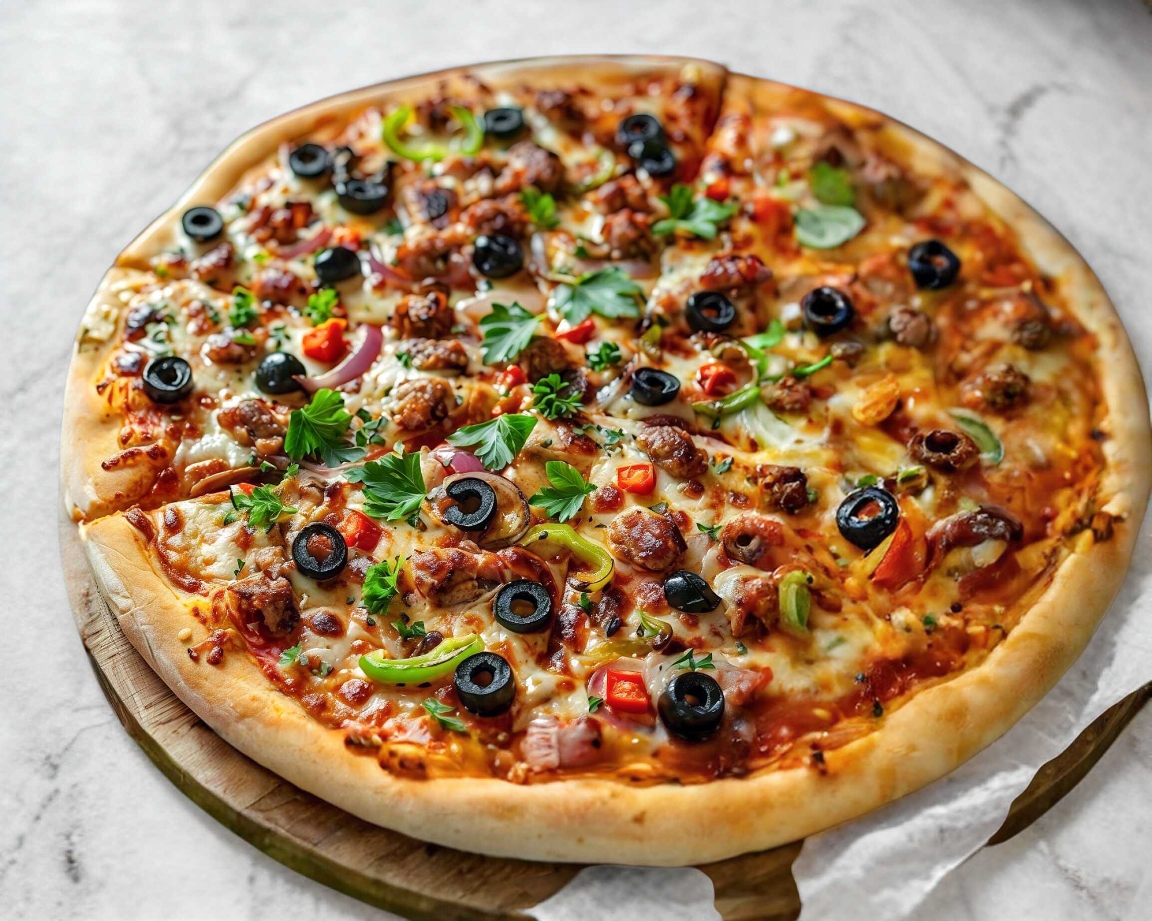 Salsa de tomate, queso mozzarella, aceitunas negras, cebolla y pimienton verde/rojo,