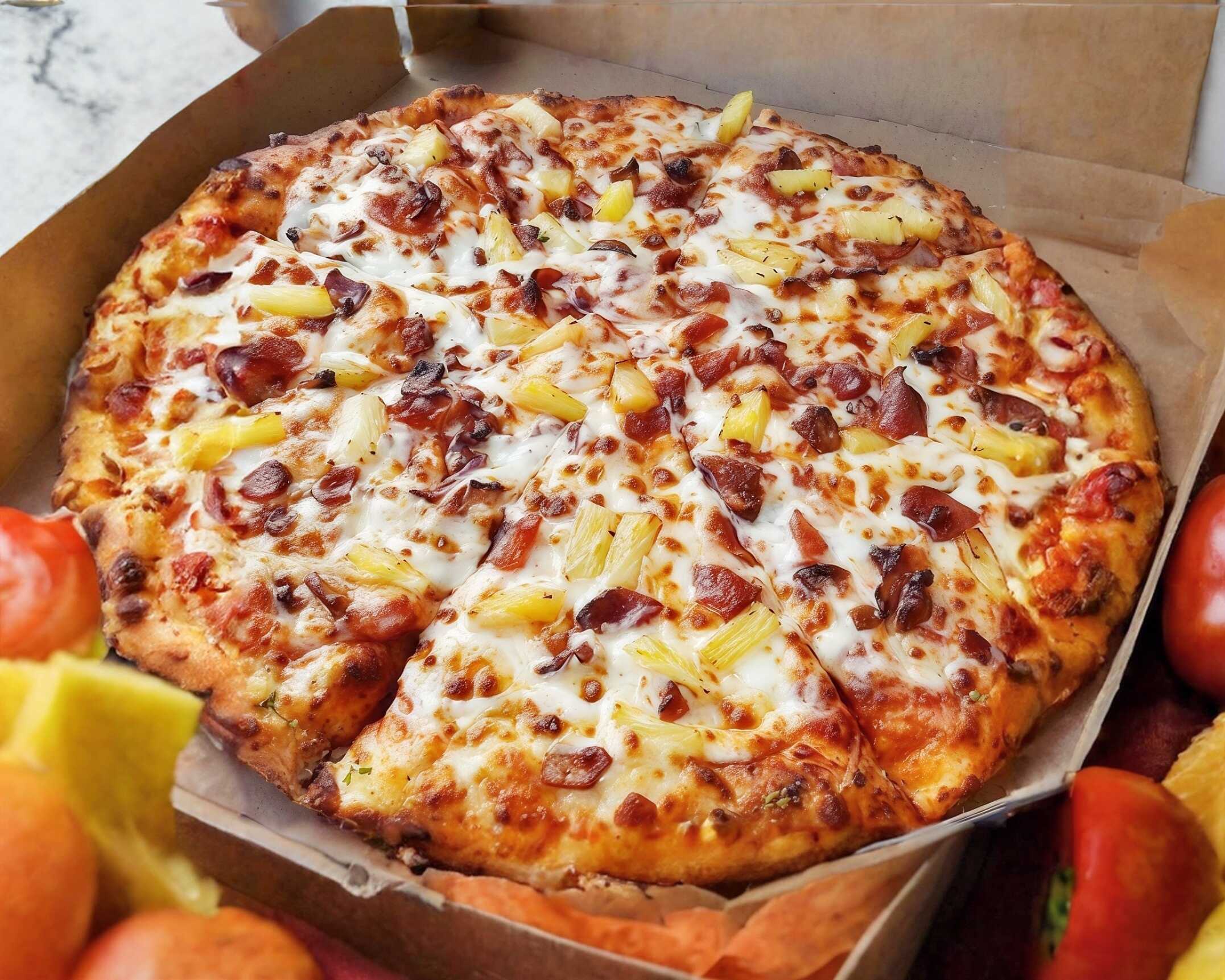 Salsa de tomate, queso mozzarella, trozos de tocino y piña