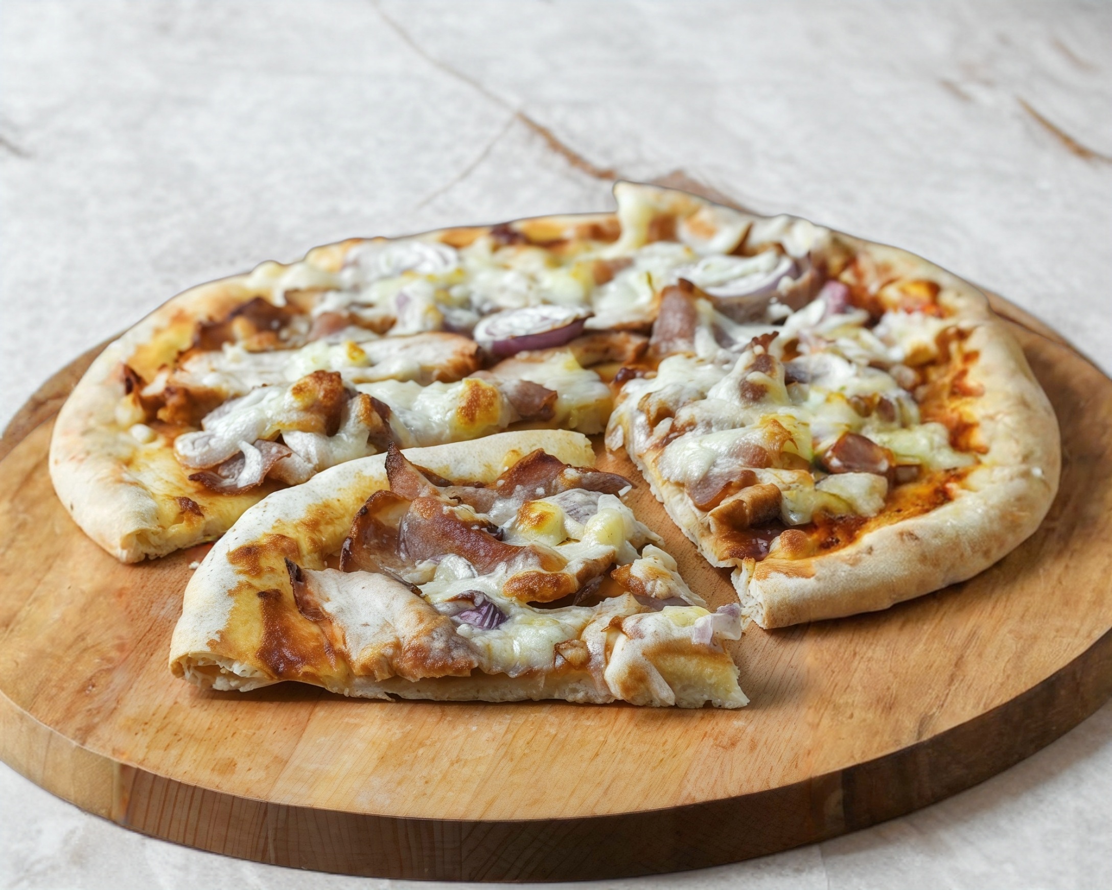 Salsa de tomate, cuatro quesos y trozos de tocino premium
