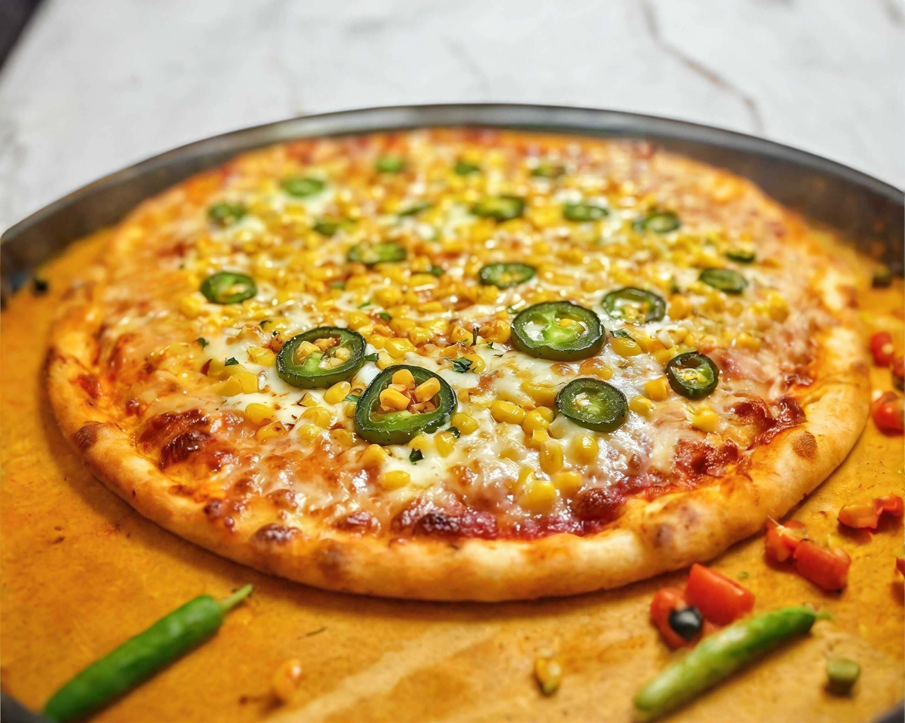 Salsa de tomate, queso mozzarella, elote y rodajas de jalapeño
