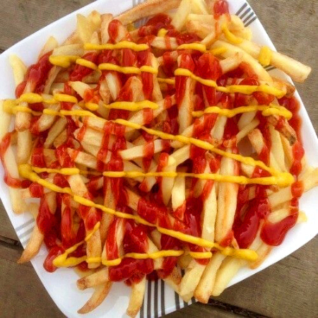 Papas a la francesa con queso amarillo y catsup