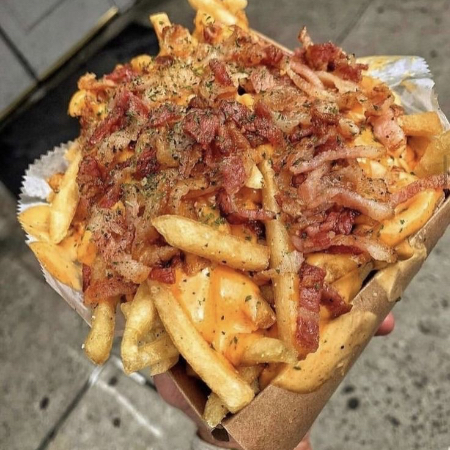 Papas a la francesa crujientes, queso líquido, trozos de tocino y especias italianas