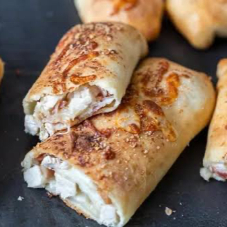 Rollo relleno de pechuga de pollo premium, queso mozarella, tocino ahumado, aderezo césar y cebolla finamente picada