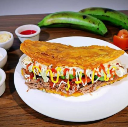 Patacón (plátano macho frito) con carne deshebrada, queso manchego, aguacate, tomate, mayonesa, cátsup, mostaza, salsa de ajo o guasacaca (salsa de aguacate y cilantro).