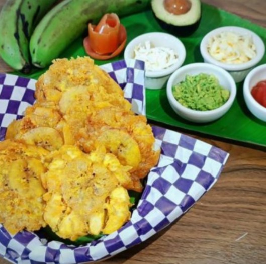Patacón 250 g de plátano macho frito, con pollo deshebrado, queso manchego, aguacate, tomate, mayonesa, cátsup, mostaza, salsa de ajo o guasacaca (salsa de aguacate y cilantro).