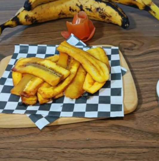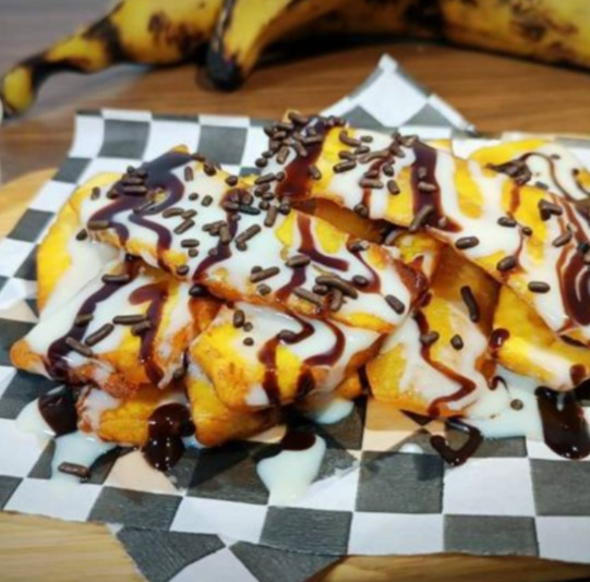 250 g de plátano macho frito, con topping de leche condensada, chocolate, cajeta, o sirope de fresa (salsa de fresa).