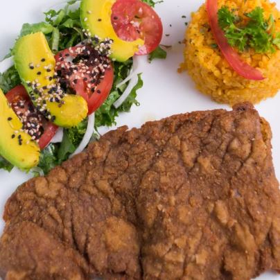 Milanesa de res empanizada, acompañada de arroz y ensalada.