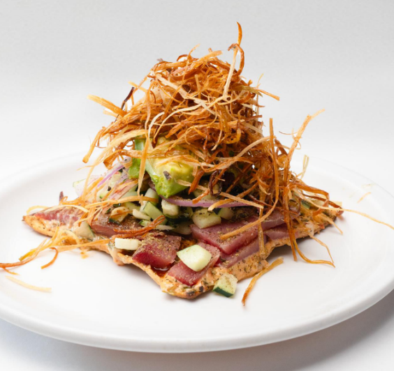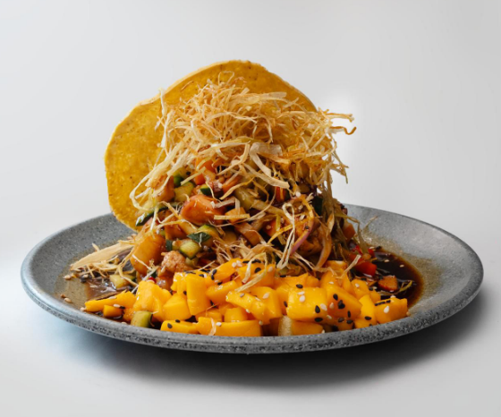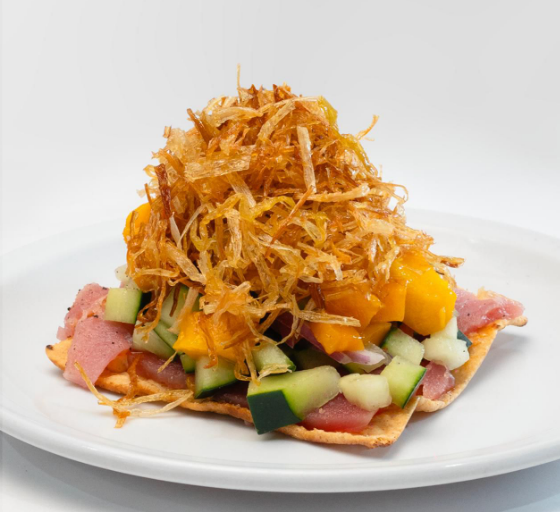 Laminas de atun fresco, montada sobre una tostada de ajonjolí, aderezo de chipotle, salsa de habanero caramelizada, pepino, cubos de mango, cebolla morada, aguacate, sal, y pimienta, orégano y poro frito.