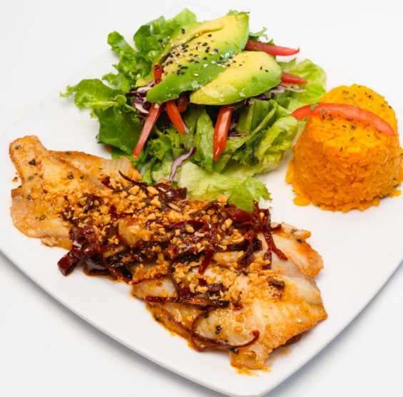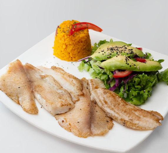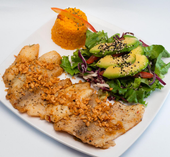 Filete empanizado o a la plancha, bañado en una salsa de mango dulce y coco frito, guarnición a elección.