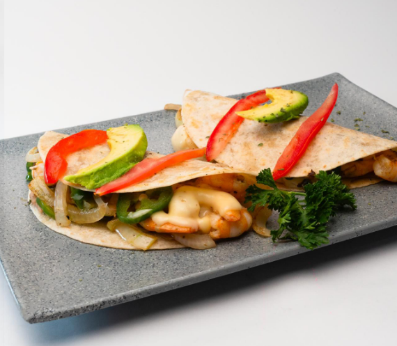 Camarón pacotilla, marlín ahumado, con cebolla, chile morrón, tocino, epazote, montados en una tortilla de harina con frijoles y gratinado con queso manchego.