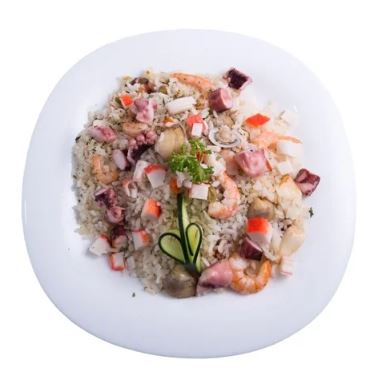 Arroz con un mix de mariscos (camarón, calamar, surimi, almeja), sazonado al mojo de ajo.