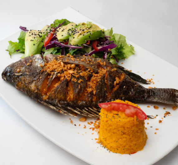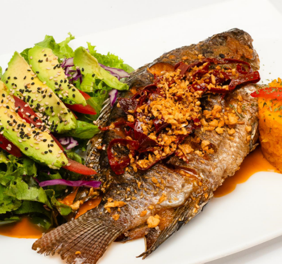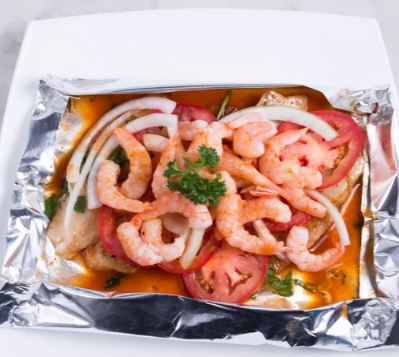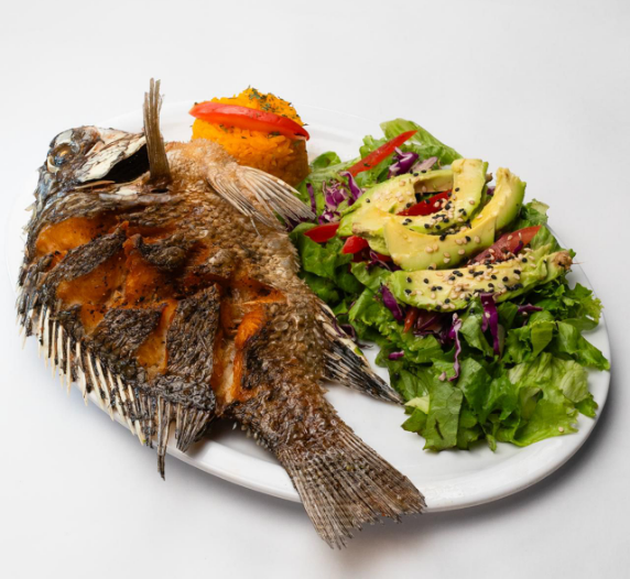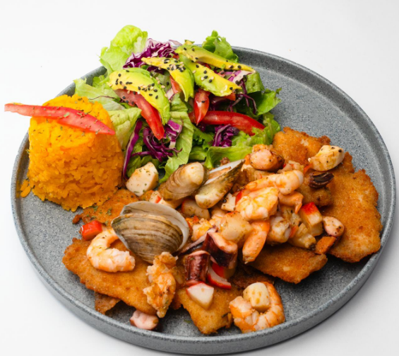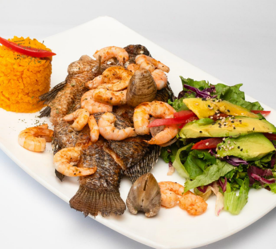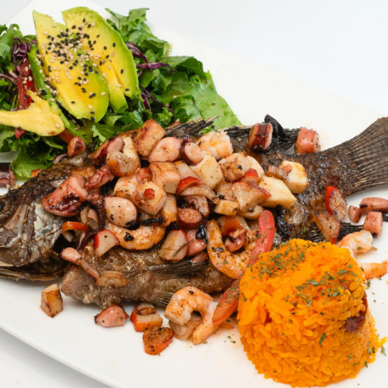 Mojarra frita en aceite, bañada de un mix de mariscos (camarón, calamar, pulpo, surimi y almejas), sazonados a la mantequilla, acompañada de arroz y ensalada.