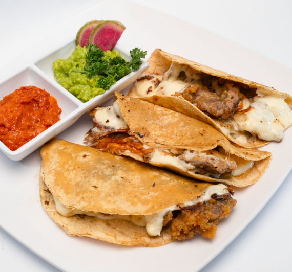 Tacos de milanesa, gratinados con queso Oaxaca, acompañado de salsa de árbol y guacamole.