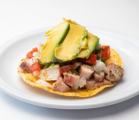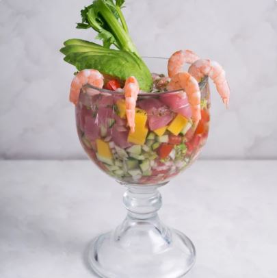 Cubos de atún fresco, camarón pacotilla, pepino, cebolla morada, chile habanero, cubos de mango, aguacate, jugo de limón, sal, pimienta, orégano, aceite de olivo y salsa soya.