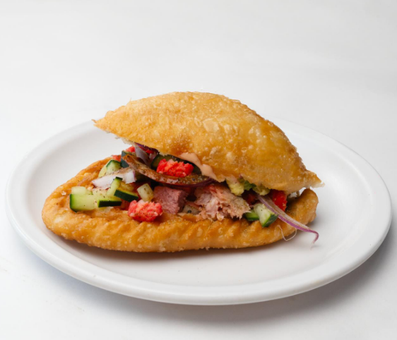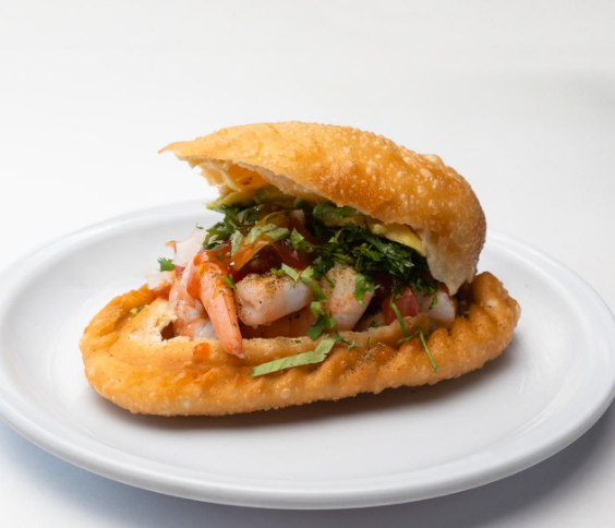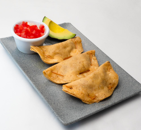 Empanada rellena de atún a la mexicana y camarón, acompañada con jitomate, cebolla, cilantro, aguacate, mayonesa, catsup, sal, pimienta, orégano y salsa soya.